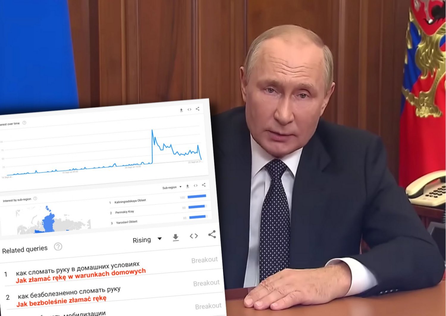 Ciekawe zjawisko w rosyjskim internecie. Po ogłoszeniu częściowej mobilizacji w kraju patriotów i nacjonalistów najczęściej wyszukiwanym hasłem w Google stało się "Jak złamać rękę w warunkach domowych". Kolejne pozycje na liście również nie pokrywają się z dotychczasowymi nastrojami Rosjan.