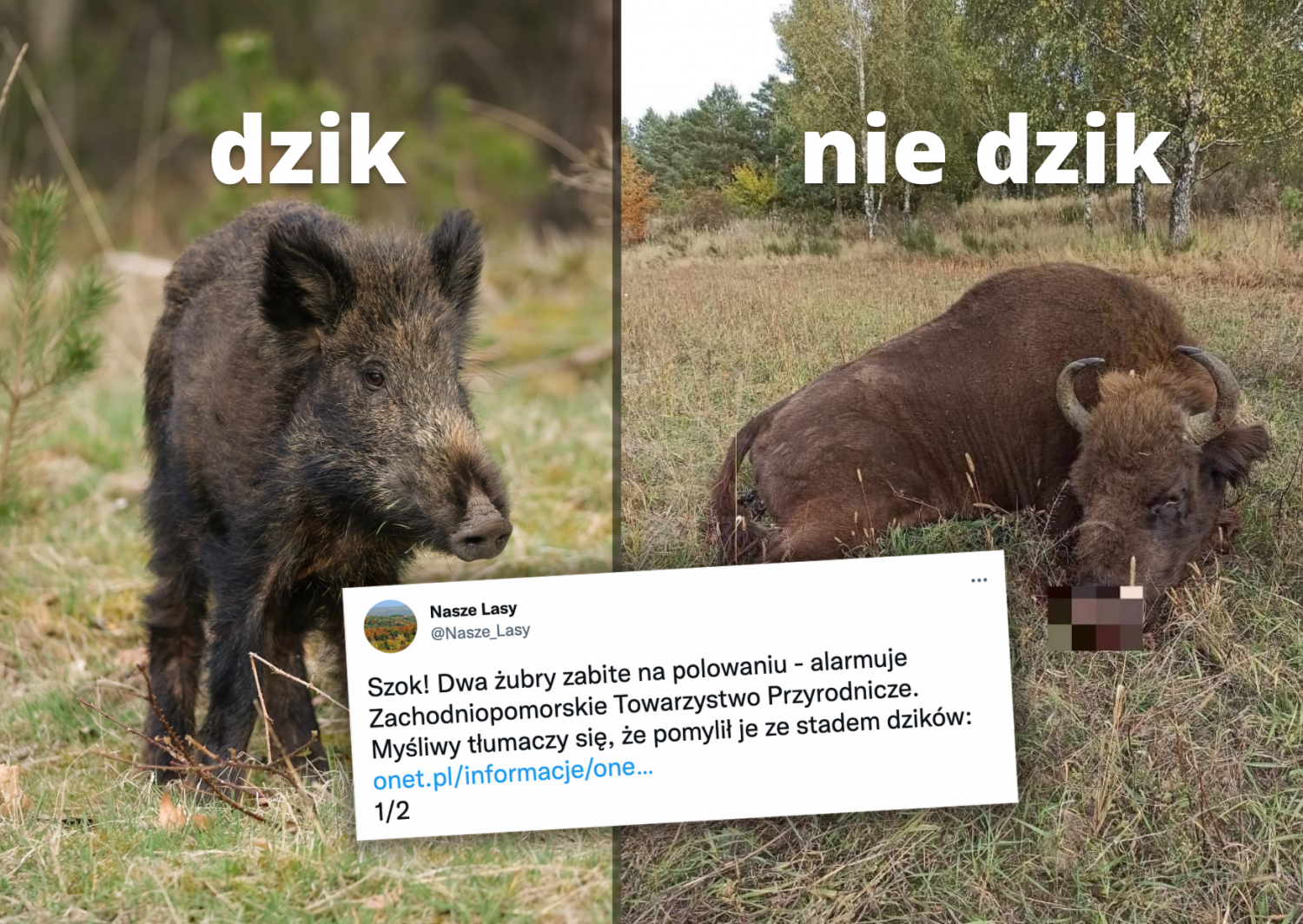 Na terenie poligonu drawskiego w woj. zachodniopomorskim dzień po dniu znaleziono zastrzelone w tej samej okolicy dwa żubry. Do zabicia jednego z nich przyznał się myśliwy, który wytłumaczył, że pomylił żubra z dzikiem. Trwa ustalanie, czy ten sam oszołom zastrzelił też drugą samicę, my tymczasem przygotowaliśmy dla niego szybką powtórkę ze zwierzątek, żeby już więcej nie popełniał takich głupiutkich błędów i nie zabijał stworzeń, które nie tylko w niczym nie zawiniły, ale też należą do gatunków chronionych.