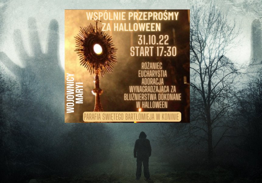 31 października w jednym z konińskich kościołów odbędą się „wspólne przeprosiny za Halloween”. Jak można się dowiedzieć z grafiki promującej imprezę, uroczystość obejmuje: różaniec, eucharystię, adorację wynagradzającą za bluźnierstwa dokonane w Halloween.