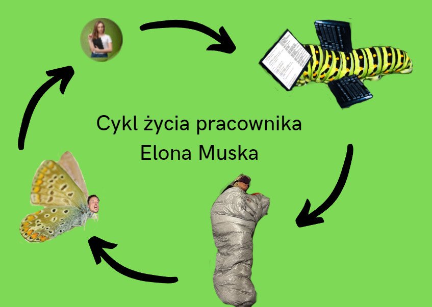 Niezwykłe odkrycie naukowców! Według najnowszych badań bycie pracownikiem Elona Muska przypomina cykl życia motyla. Jest to swoista rekonstrukcja znanego „od zera do bohatera”, ale w formie „od jaja do motyla”, z tym że większość osobników zatrzymuje się na etapie poczwarki.