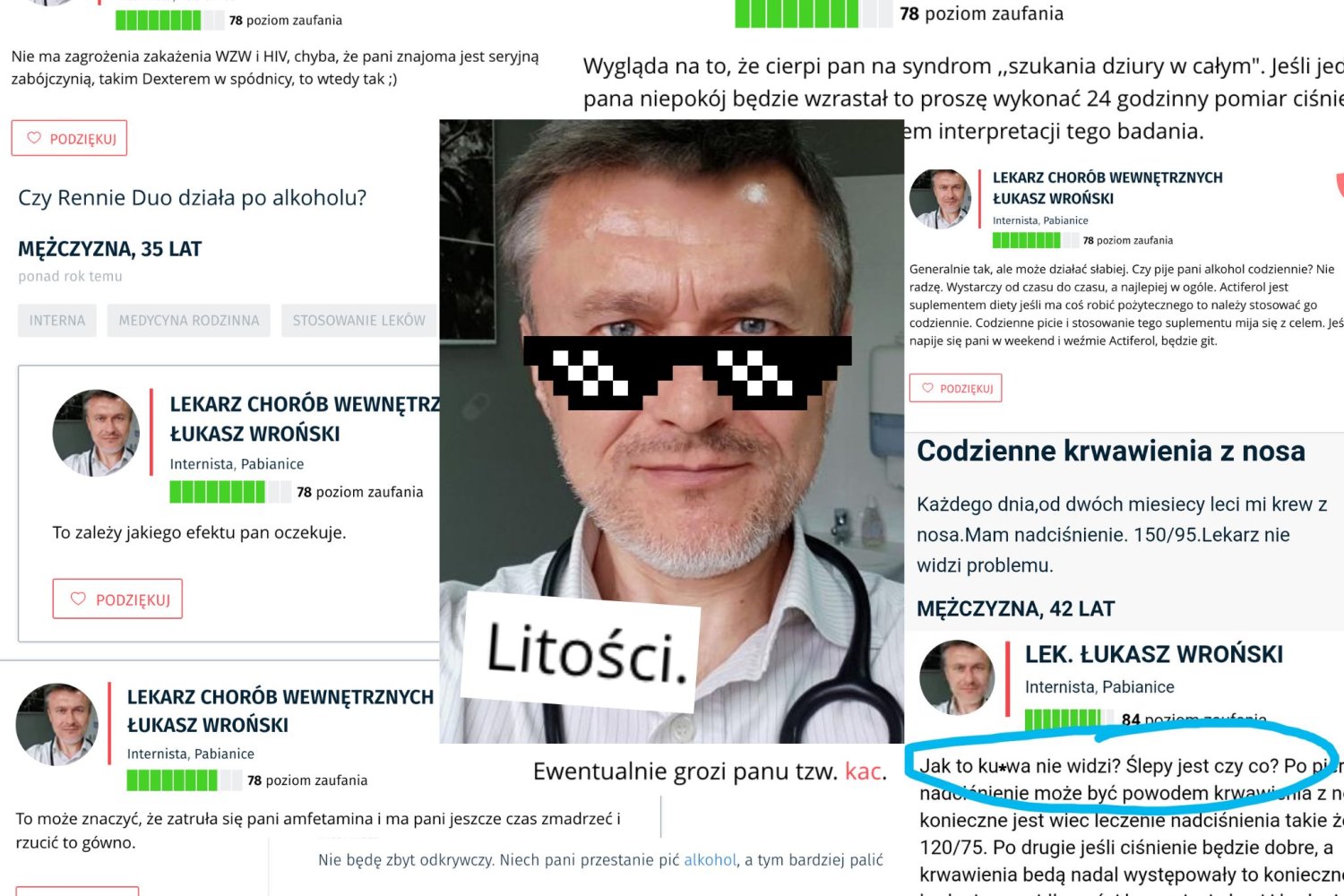 Mimo ciętego języka, jakim wykazuje się dr Wroński w internecie, pozytywne opinie na jego temat na portalu znanylekarz.pl świadczą o tym, że na co dzień pan Łukasz jest po prostu dobrym, dbającym o dobro pacjenta, miłym i cierpliwym lekarzem.