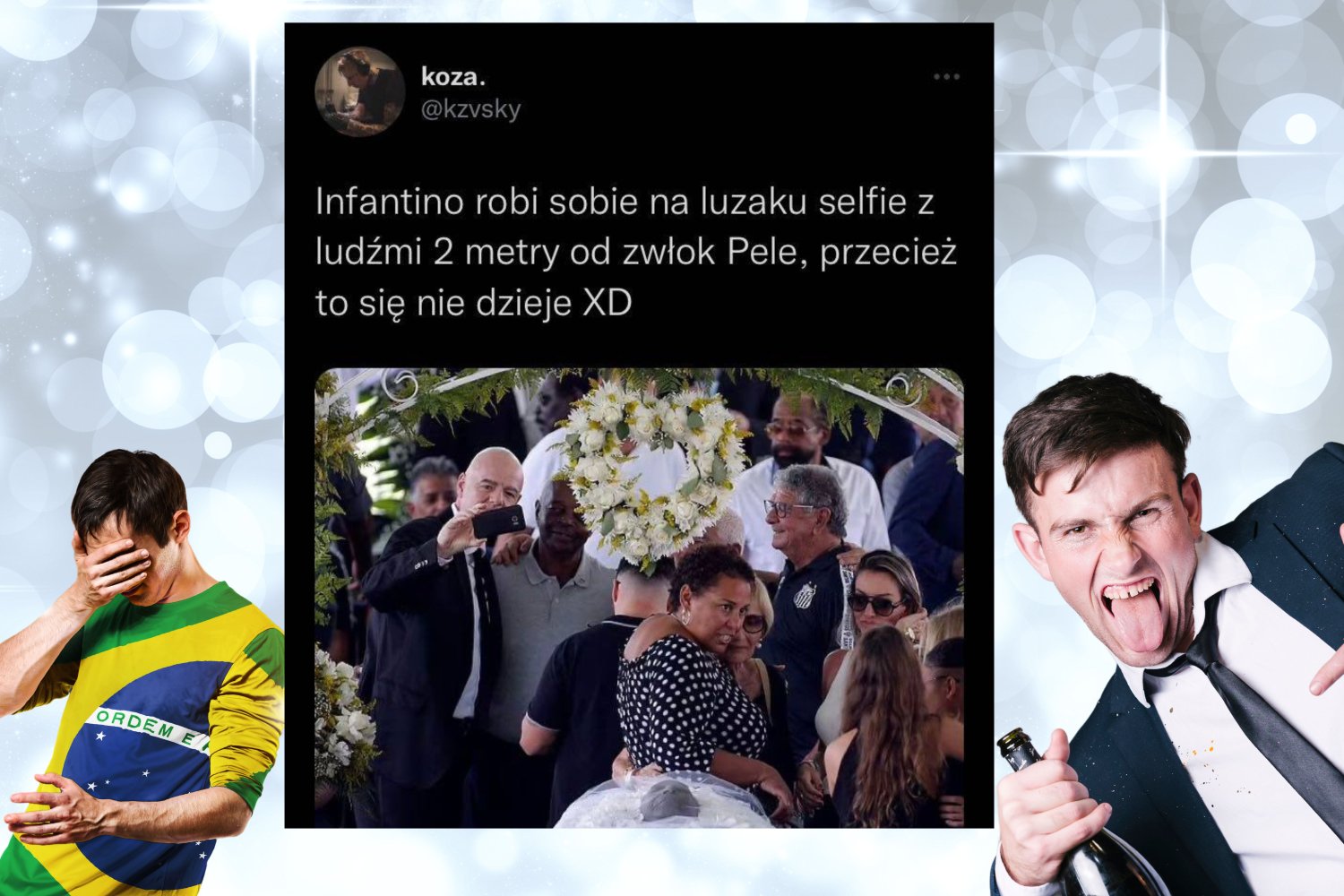 Nie ma to jak złapać za aparat i zrobić sobie pamiątkowe zdjęcie na pogrzebie legendy futbolu - Pelego. Niektórzy mogliby pomyśleć, że to mało odpowiednie miejsce i czas na takie zachowanie, ale nie dla prezesa FIFA - Gianiego Infantino! On potrafi znaleźć radość w każdej sytuacji.