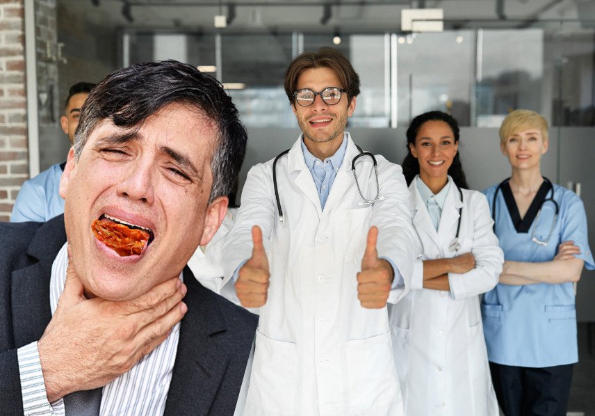 Lekarz chciał przeprowadzić z nim wywiad, ale pacjent odmawiał współpracy, cały czas się krztusząc. Pracownik szpitala już zbierał się do udzielania pomocy, ale, na szczęście, drugi lekarz wyczuł z ust pacjenta sos sojowy i imbir.