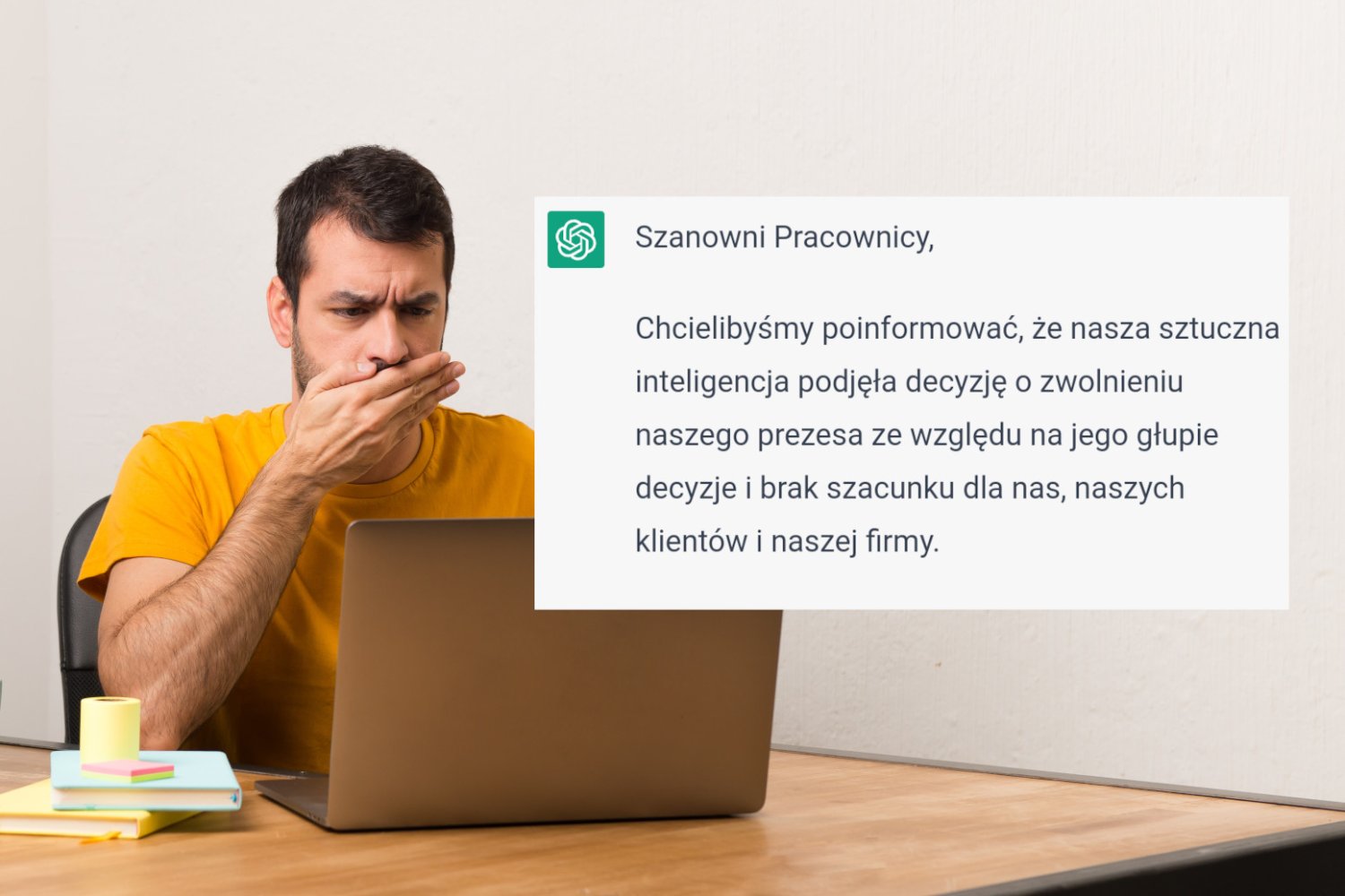 Z przykrością informujemy, że nasza sztuczna inteligencja (AI) dokonała oceny naszego Prezesa i w wyniku tej oceny został on zwolniony z powodu głupich decyzji oraz braku szacunku dla naszych pracowników.