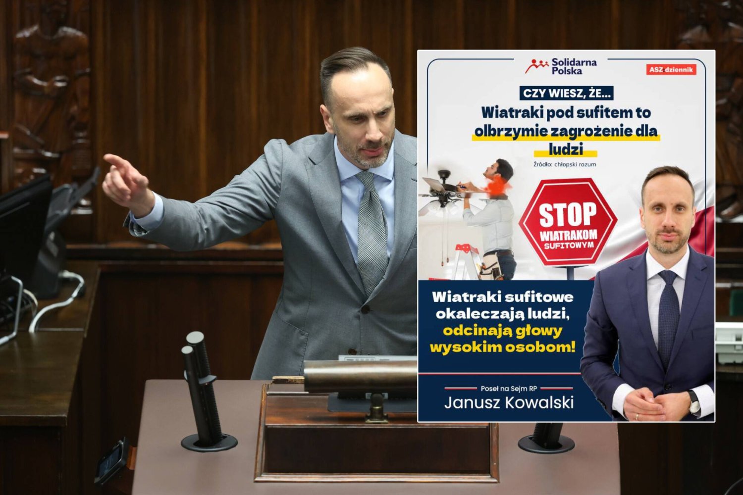 Antywiatrakowa kampania Janusza Kowalskiego trwa. Poseł Solidarnej Polski ostrzegał już przed farmami wiatrowymi. Teraz zwraca uwagę na zagrożenia ze strony wiatraków sufitowych. – To spisek niskich polityków z Brukseli, którzy nienawidzą Polaków idących z podniesionymi czołami – przekonuje Kowalski.