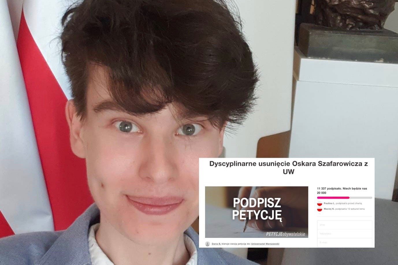 Ważna inicjatywa. Tysiące osób chce pomóc Oskarowi Szafarowiczowi, studentowi Uniwersytetu Warszawskiego, w znalezieniu czasu na angażowanie się w działania promujące rząd oraz Prawo i Sprawiedliwość. W tym celu powstała specjalna petycja o usunięcie Szafarowicza z uczelni.