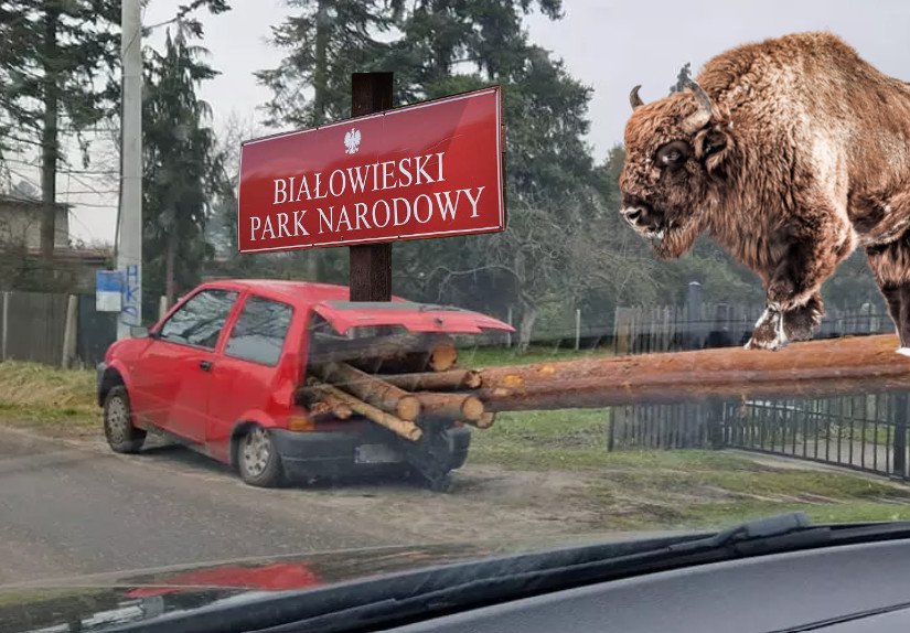 Puszcza Białowieska w końcu bezpieczna i otulona ze wszystkich stron polskimi granicami! Zadbał o to kierowca słynnego cinquecento, który zaczął przewóz puszczy od pojedynczych drzew, aż w końcu udało mu się przetransportować cały kompleks leśny o pow. ok. 1500 km². Brawo!