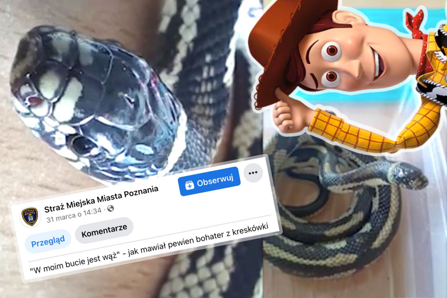 O znalezisku strażnicy poinformowali, cytując w swoich mediach społecznościowych słowa Chudego z Toy Story: "W moim bucie jest wąż".