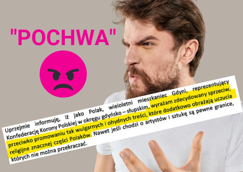– Uprzejmie informuję, że jako Polak, wieloletni mieszkaniec Gdyni reprezentujący Konfederację Korony Polskiej w okręgu gdyńsko-słupskim, wyrażam zdecydowany sprzeciw przeciwko promowaniu tak wulgarnych i ohydnych treści, które dodatkowo obrażają uczucia religijne znacznej części Polaków – donosi Niżnik. – Nawet jeśli chodzi o artystów i sztukę są pewne granice, których nie można przekraczać. W związku z powyższym domagam się usunięcia wspomnianej sztuki z grona prac wyróżnionych i jednocześnie publiczne przeprosiny – za jak mam nadzieję – omyłkową promocję tej sztuki.