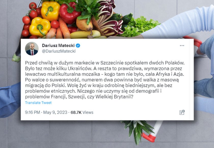 Robienie zakupów wiąże się z ryzykiem. W sklepie można spotkać samotne banany, spleśniałe pomidory, a czasem nawet ludzi różnych narodowości. Dariusz Matecki postanowił opisać to nieprzyjemne zdarzenie na Twitterze. Okazuje się, że problemem etnicznym jest to, że z marketów korzystają bezczelni bezwstydnicy, którzy nie są Polakami.