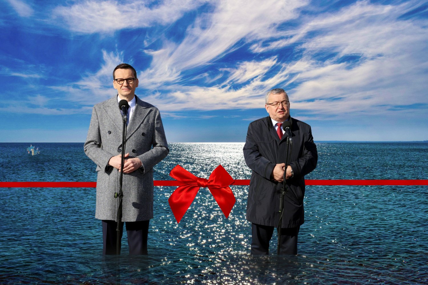 Podczas zorganizowanej na płyciźnie konferencji prasowej premier nie szczędził ostrych słów poprzednikom. – Droga z Dani do Szwecji była dla wielu mieszkańców koszmarem. Żaden rząd przed nami nie mógł w odpowiednim czasie dokończyć tych wszystkich ujść do morza. Dzisiaj, kochani rodacy, rzucamy kotwicę na otwartym i wolnym Bałtyku – powiedział Mateusz Morawiecki. – Rozumiemy, czego potrzebują Polacy. To właśnie takich inwestycji zazdroszczą nam Czesi, Słowacy czy nawet bogaci Szwajcarzy. Premier przeciął symboliczną morską wstęgę, a potem rzucił do wody symboliczną sieć rybacką i symboliczny kajak. Wiele osób patrząc na szamoczącego się w morzu Morawieckiego miało w oczach łzy wzruszenia.