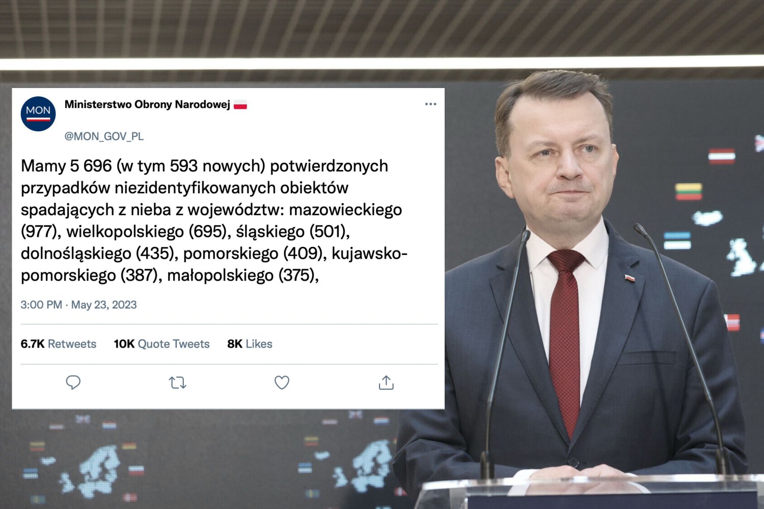 Ministerstwo Obrony Narodowej informuje o aktualnej sytuacji dotyczącej niezidentyfikowanych obiektów spadających z nieba. Na dzień dzisiejszy potwierdzono 5 696 przypadków takich zdarzeń, w tym 593 nowych. Jesteśmy w trakcie ustalania ich pochodzenia i przeznaczenia - czytamy na Twitterze.