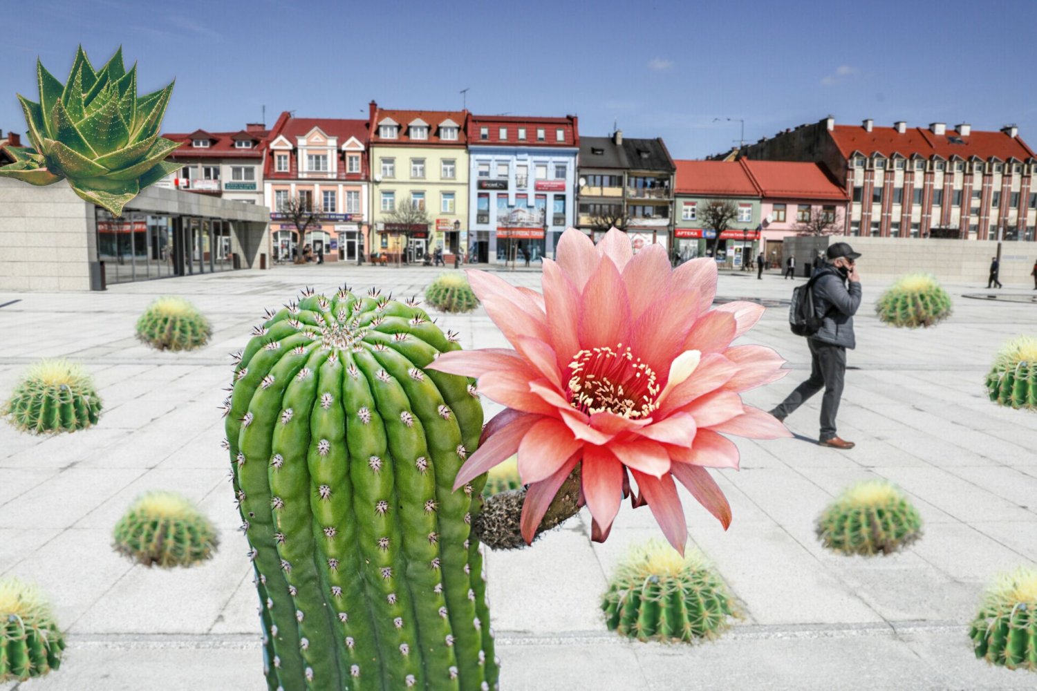 To właśnie na rynku w Kutnie – miejscu, które dwa lata temu wygrało nasz plebiscyt na najlepiej zabetonowane miejsce w Polsce – posadzono pierwsze sukulenty, dzięki którym tranzycja Polski z klimatu umiarkowanego ciepłego przejściowego do klimatu podrównikowego suchego ma być mniej drastyczna.