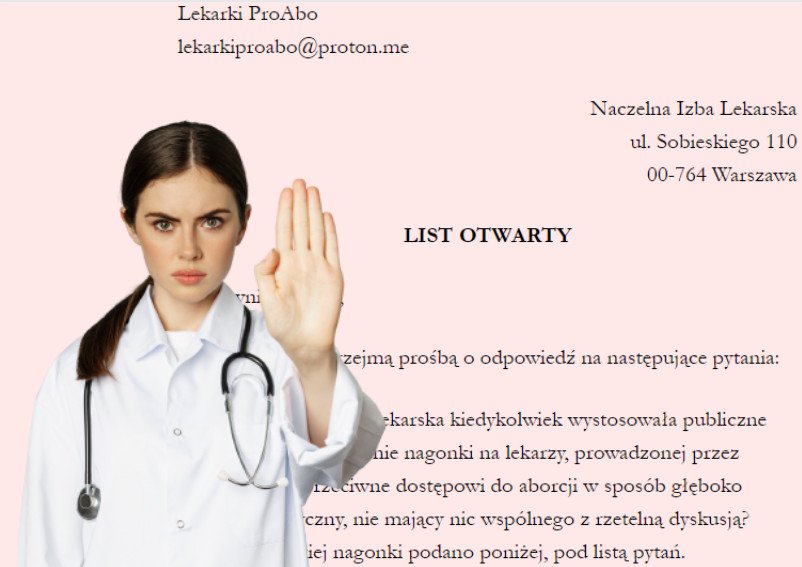 „Czy – jeśli reagowano – reakcje na pikiety pod szpitalami w całej Polsce, organizowane przez m.in. Fundację Pro – Prawo Do Życia, czy Fundację Życie i Rodzina, ze strony samorządu lekarskiego miały kiedykolwiek charakter publiczny, czy ograniczały się wyłącznie do korespondencji prywatnej?” – pytają lekarki w liście otwartym do Naczelnej Izby Lekarskiej.