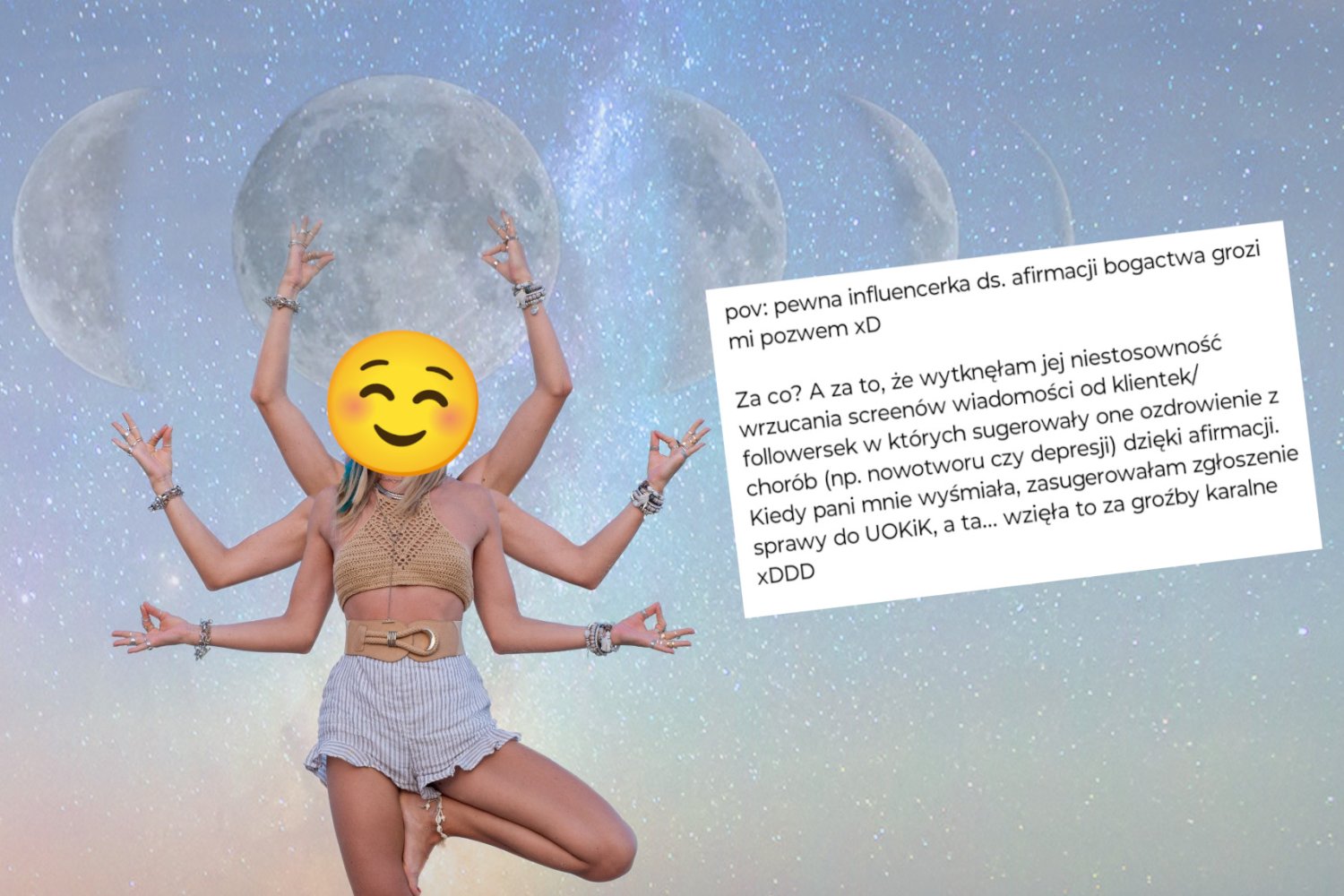 Pani Anna zauważyła to i zareagowała. W prywatnej wiadomości zwróciła influencerce uwagę, że nie warto szarżować z tym tematem. Bo wiecie, ktoś może jeszcze pomyśleć, że pozytywna afirmacja może zastąpić onkologa, psychiatrę czy terapeutę. Pani Anna zapowiedziała, że zgłosi tę sprawę do zbadania przez UOKiK, bo klienci mogą być wprowadzani w błąd.