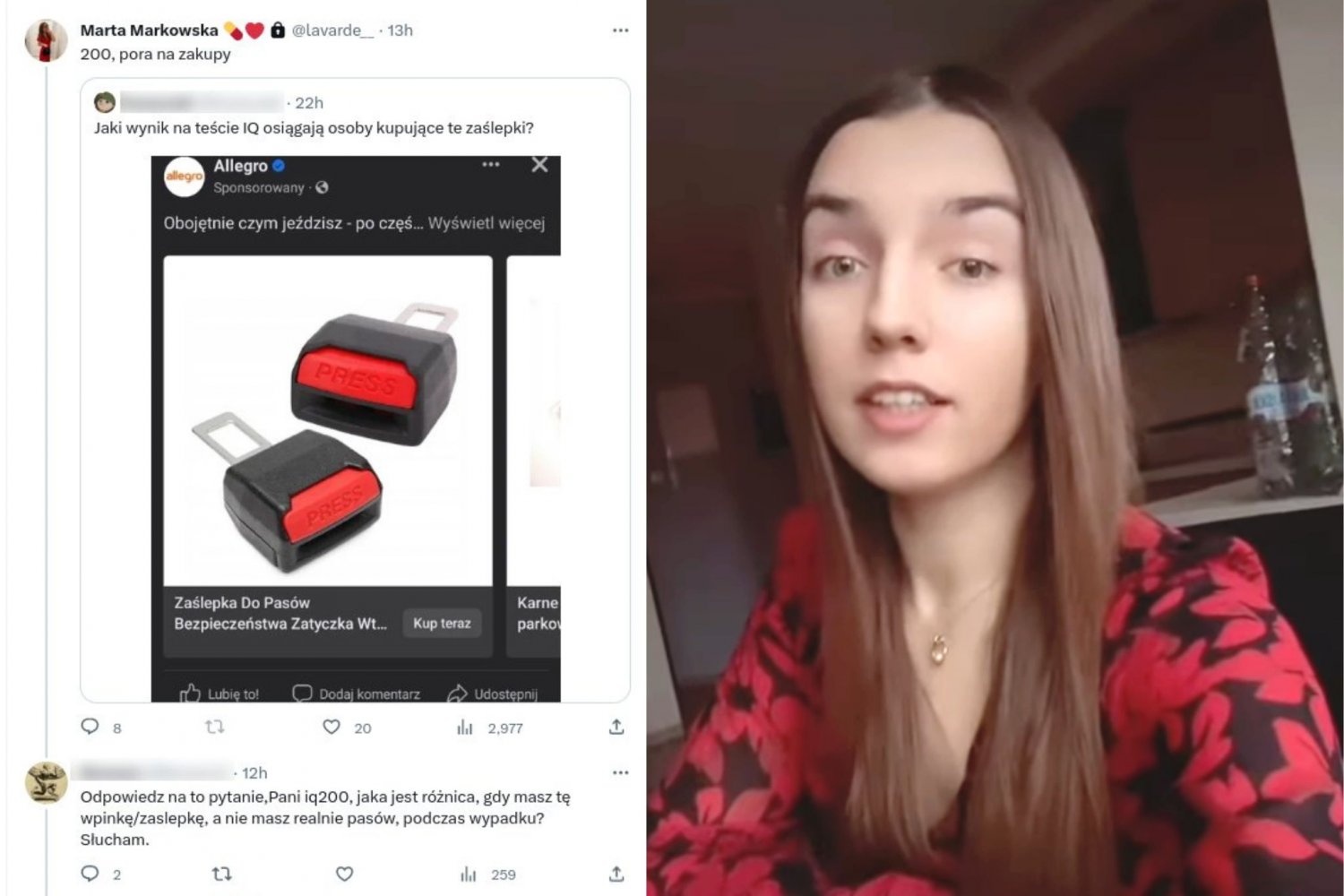 23-letnia "dziennikarka" pisma "Najwyższy CZAS!" pochwaliła się na swoim Twitterze metodą, która ma duże szanse zmniejszyć liczebność osób cofających gatunek ludzki w rozwoju: niezapinanie pasów bezpieczeństwa i zastępowanie ich zaślepkami z Allegro.