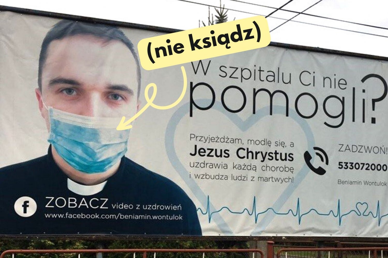 Można by pomyśleć, że Beniamin jest katolickim księdzem, bo na billboardach występuje w koloratce. Nic bardziej mylnego!