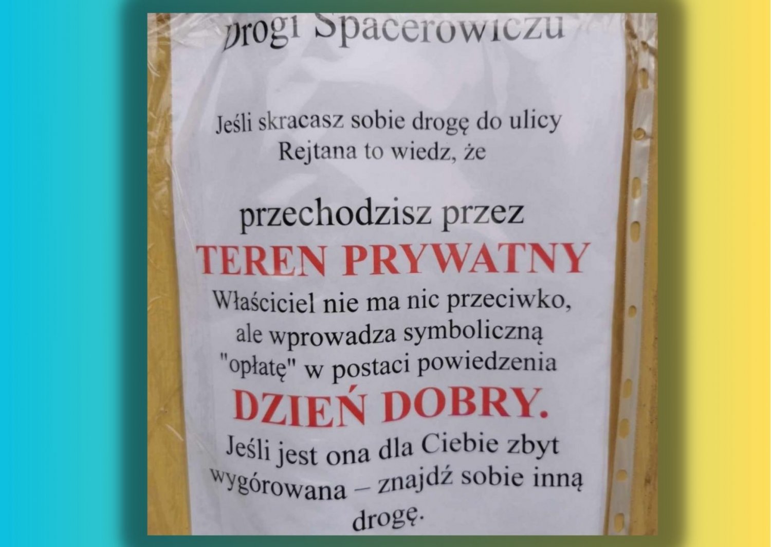 Tym razem na Pomorzu turystów zaskoczyła innego rodzaju opłata: wyartykułowanie z siebie „dzień dobry”. Na karteczce umieszczonej na łączniku z ulicy Rejtana w stronę alei Kociewskiej w Kociewie czytamy: