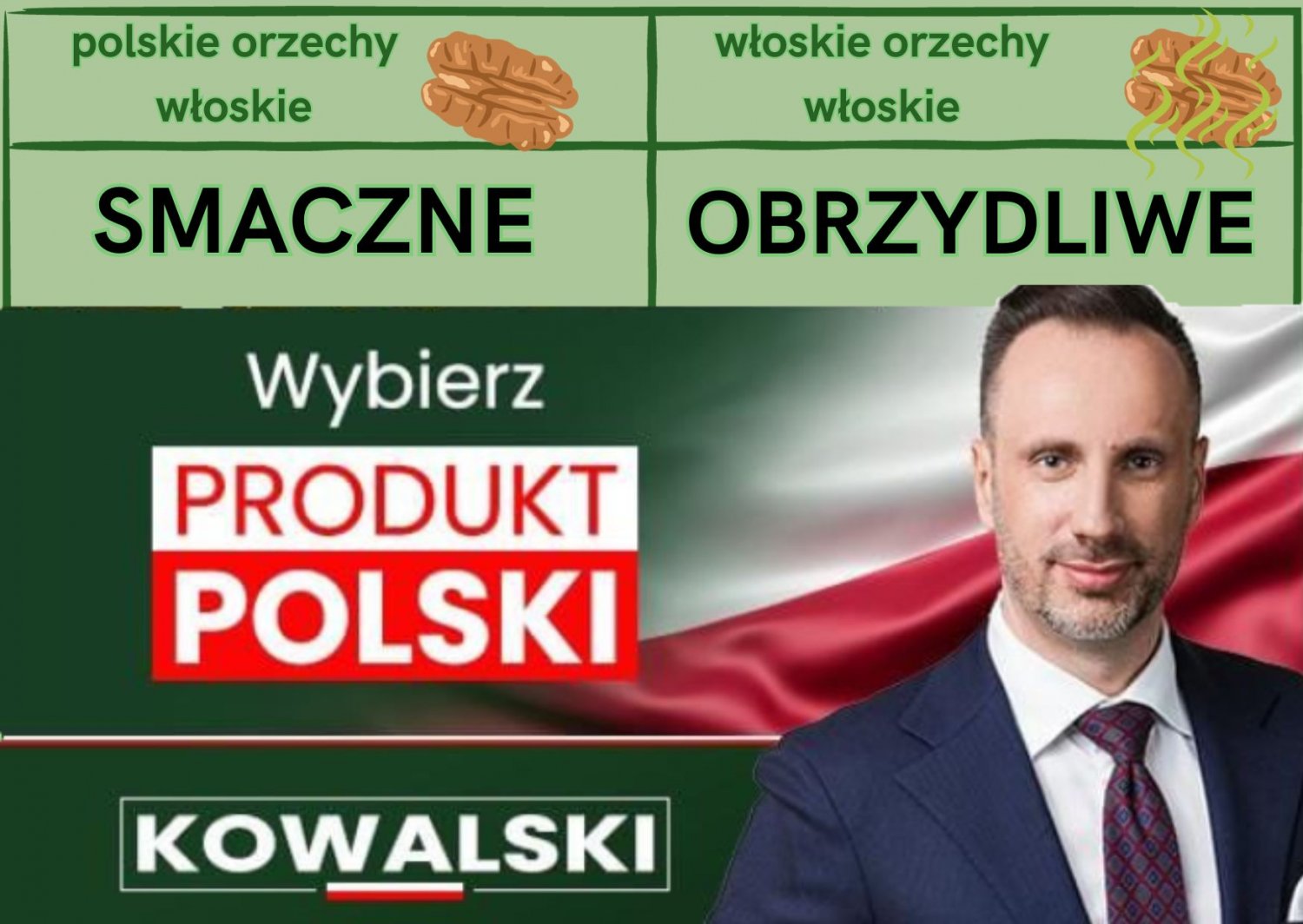 Na supremacji polskich orzechów włoskich nie koniec. Kowalski podtrzymuje swoje stanowisko również w sprawie polskich orzechów brazylijskich, polskich pierogów ruskich oraz polskiej mieszanki warzyw meksykańskich.