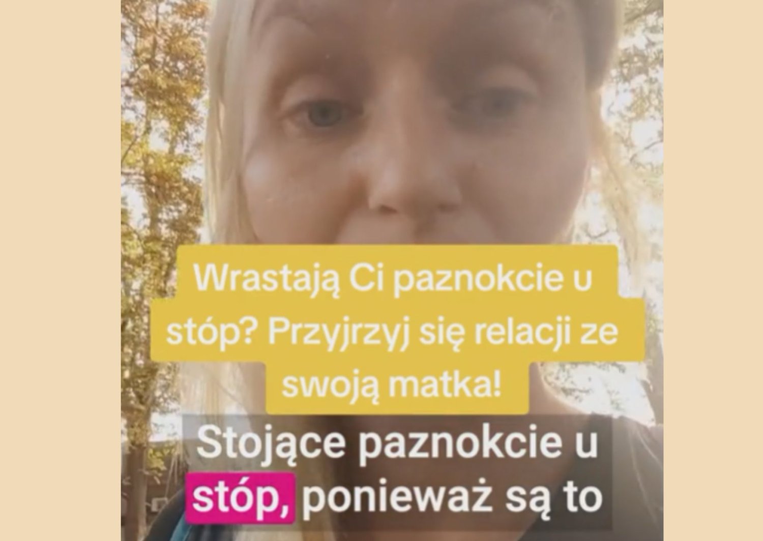 – Ponieważ są to paznokcie u stóp, a stopy związane są z mamą, konflikt też dotyczy mamy. Najczęściej wrastające paznokcie u stóp sygnalizują niewyrażoną agresję w związku z mamą (…). Zwróć na to uwagę, kiedy kolejny raz doświadczasz paznokci, które wbijają się nie tam, gdzie trzeba.