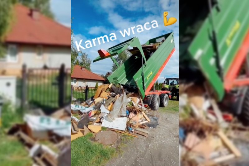 Somsiad z polskiej wsi miał nienajlepszy dzień. Wysypał sobie spokojnie stertę śmieci w przydrożne krzaki koło pola i myślał, że ma z nimi spokój. A tutaj ktoś śmieci zebrał, zapakował na przyczepę ciągnika, odnalazł właściciela i wysypał mu przed bramą posesji.