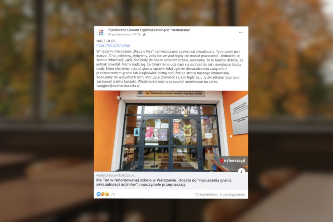 Molestowanie seksualne zawsze jest okropne, a kiedy dzieje się w szkołach, w stosunku do niepełnoletnich osób, jest jeszcze okropniejsze niż zwykle. "Gazeta Wyborcza" opublikowała tekst, w którym opisuje #metoo na Bednarskiej - jednym z najbardziej znanych warszawskich społecznych liceów, takim z demokracją szkolną i bez dzwonków.