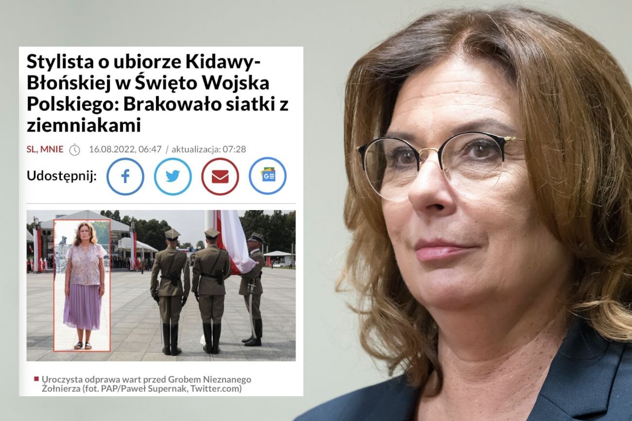 "Brakowało siatki z ziemniakami" - czytamy w apokaliptycznym nagłówku, który wiele wnosi do życia każdego Polaka. By czytelnicy mogli sami ocenić, czy zgadzają się ze zdaniem stylisty, w czerwonej ramce na ilustracji uwidoczniona została sylwetka Kidawy-Błońskiej. Polityczka jest ubrana w jasną bluzkę w łączkę, ma również lawendową spódnicę i sandały.